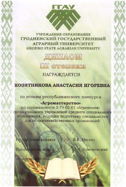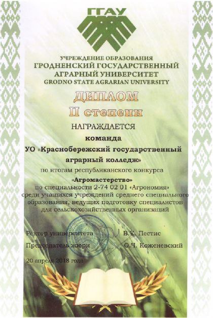 С 18 по 20 апреля 2018 года на базе Гродненского государственного аграрного университета проводился 2 этап республиканского конкурса «Агромастерство» по специальности «Агрономия» среди учащихся учреждений среднего специального образования, ведущих подготовку специалистов для сельскохозяйственных организаций.